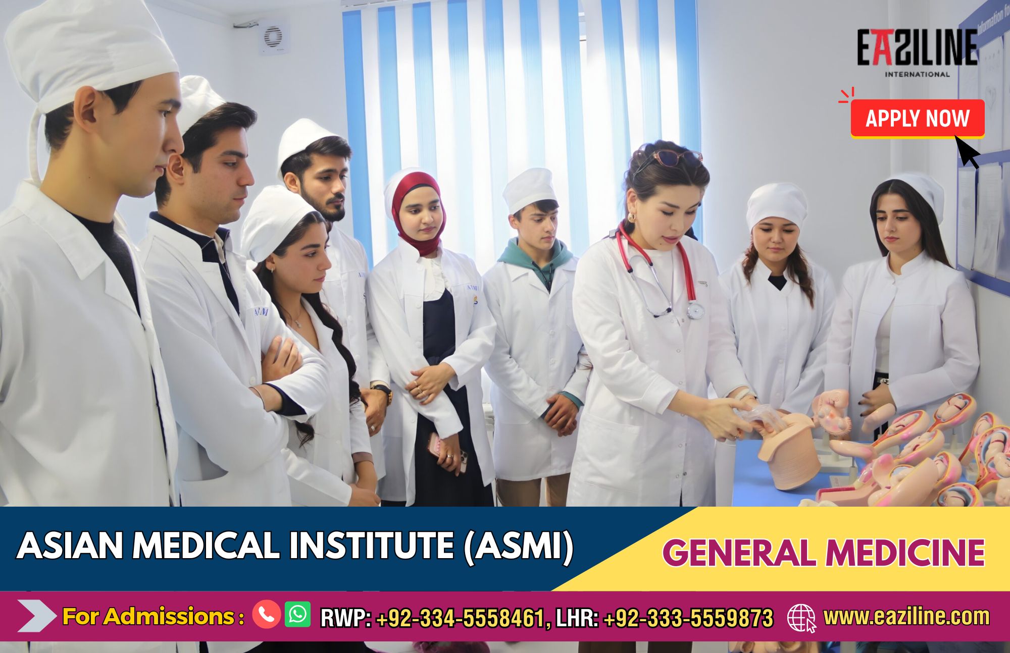 International Students can start the admission process for the General Medicine (MBBS) or Dentistry Program (BDS) in the Asian Medical Institute, Kyrgyzstan, by Applying Online Or contacting EaziLine’s admissions experts at +93-334-5558561 or +92-333-5559873.